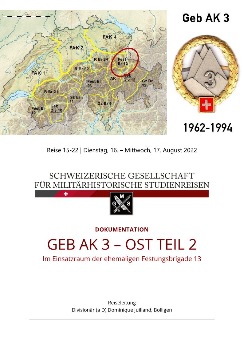 Die Reise führt in den Einsatzraum der ehemaligen Festungsbrigade 13. Es handelt sich im Wesentlichen um den nördlichen Teil des Zugangs zur Alpentransversale am San Bernardio und die Behauptung des operativen Schlüsselraums Sargans.