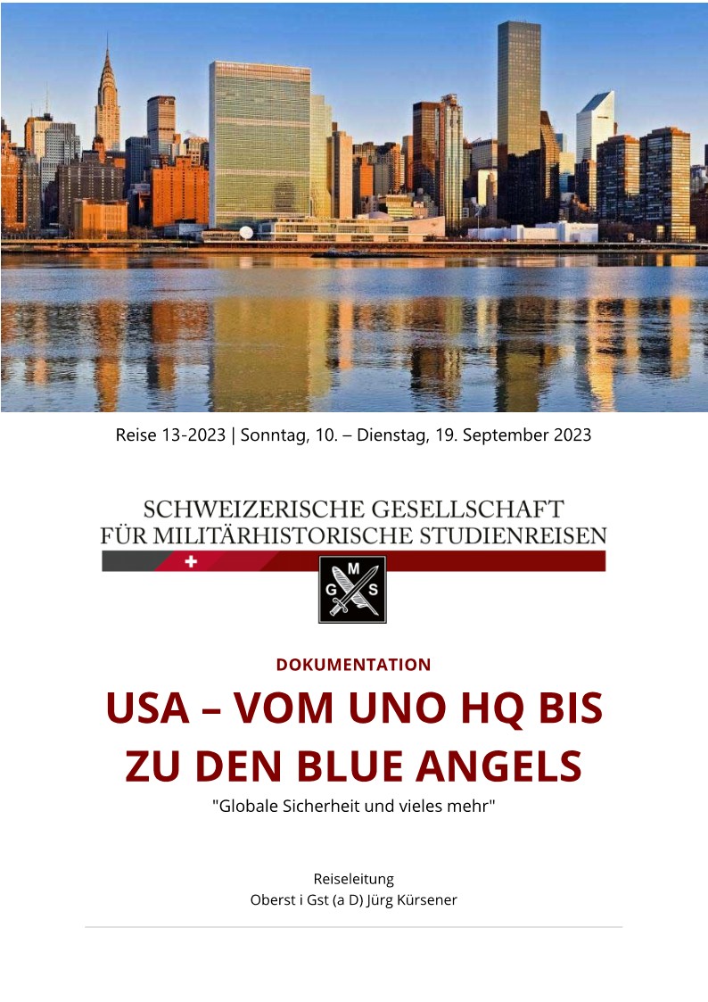 Mit Besuchen des Hauptquartiers der UNO in New York und des Flugzeugträgers USS Intrepid, der alten Hauptstadt Philadelphia mit der USS Olympia und USS New Jersey, der Schweizer Mission in Washington und diversen Sehenswürdigkeiten in und um die Hauptstadt, eines Schlachtfeldes des US Bürgerkrieges in Fredericksburg, eines Schiffs der US Navy und einer grossen Hafenrundfahrt in Norfolk sowie einer grossen Air Show mit den Blue Angels auf der NAS Oceana sammeln wir vielfältige Eindrücke von attraktiven Institutionen, Stätten und Einheiten der US Navy an der Ostküste der USA.