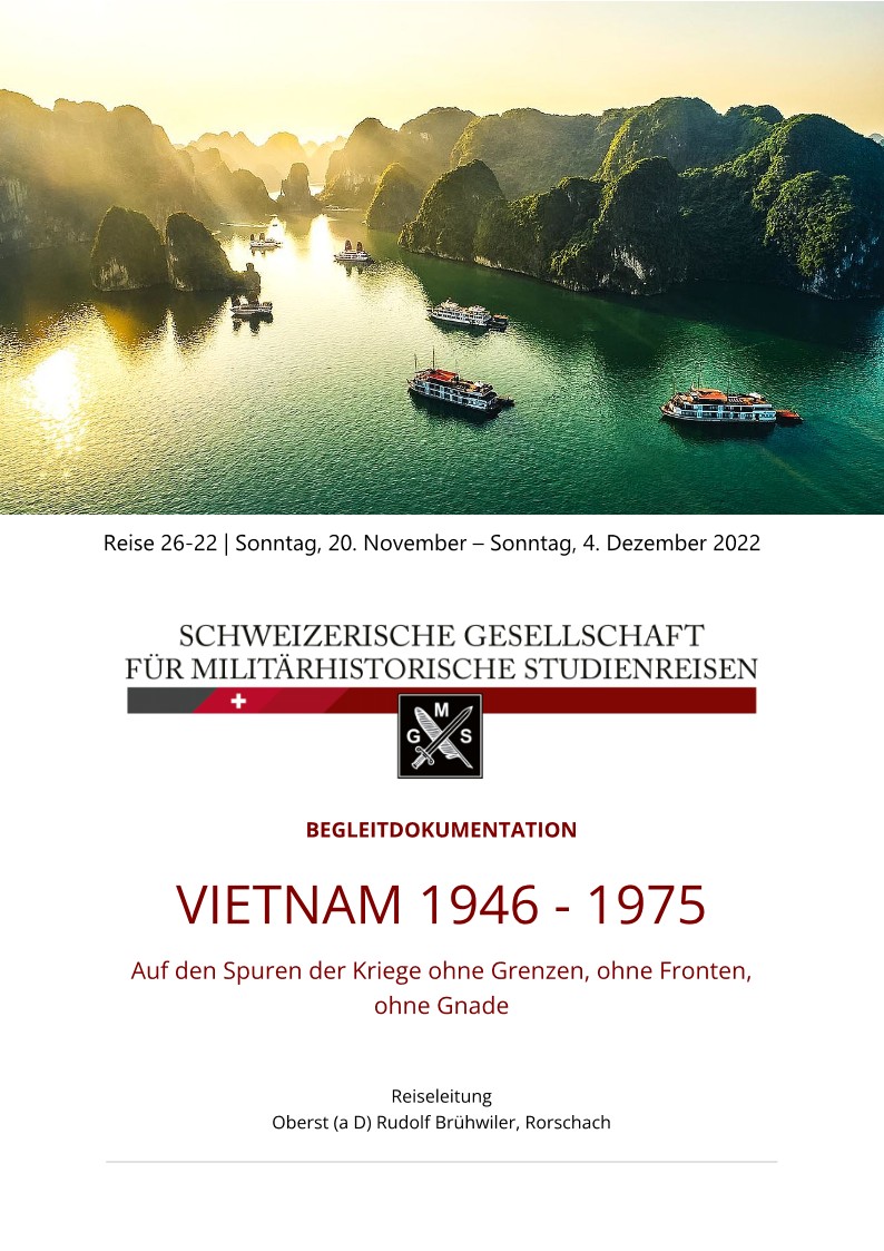 Wie gelingt es einem kleinen Volk, sich gegen die Grossmächte Frankreich und USA zu wehren und nach 30 Jahren erbitterten Kampfes die Unabhängigkeit zu erlangen? Unsere Reise führt uns an die Brennpunkte des Indochina und Vietnamkriegs (1946-1975). Wir beleuchten das Geschehen und die Aussagen der politischen und militärischen Führer, die Sicht der Soldaten und das Leben der betroffenen Zivilbevölkerung. Um die Ereignisse jener Zeit verstehen zu können, bedarf es zudem vertiefter Kenntnisse von Land, Kultur und Leute, von der Leidensfähigkeit eines einfachen Volkes und vom unerschütterlichen Willen und dem Charisma ihres Führers Ho Chi Minh. Die Reise beginnt mit dem Hinflug nach Hanoi im Norden und endet mit dem Rückflug von Saigon (Ho Chi MinhCity) im Süden. Wir besuchen Hanoi (Geschichte, Kultur, Ho Chi Minh), Dien Bien Phu, das Stalingrad der Franzosen im Indochinakrieg und sehen dort auch das einfache Leben von Thai-Minderheiten. Wir übernachten auf einer Dschunke in der Halong Bucht (UNESCO-Kulturerbe). Wir fliegen zur Königsstadt Hué, besuchen die Khe Sanh Combat Base an der Grenze zu Laos, die demilitarisierte Zone (DMZ) am 17. Breitengrad sowie die Vin Moc Tunnels am Umschlagplatz zum Ho Chi Minh Pfad. Wir fahren über den Wolkenpass nach Danang (Landung der 1. US-Truppen 1965) und Hội An, einem Marktflecken, in dem die Zeit beinahe stehen geblieben ist. Mit dem Flug nach Saigon beginnt der letzte Teil unserer Reise, bei dem wir mit einem zweitägigen Ausflug ins Mekong-Delta (BenTre/MyTho) Zeit und Ruhe finden, um über das Erlebte nachzudenken. Am letzten Tag besichtigen wir Saigon (u.a. den Wiedervereinigungspalast, das weltberühmte Kriegsopfermuseum) und beenden unsere Reise mit der abendlichen Fahrt auf dem Saigon Fluss.